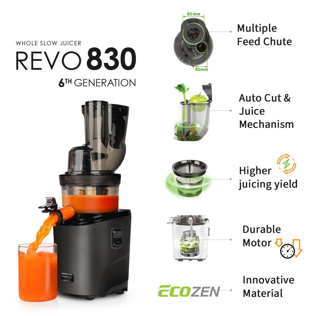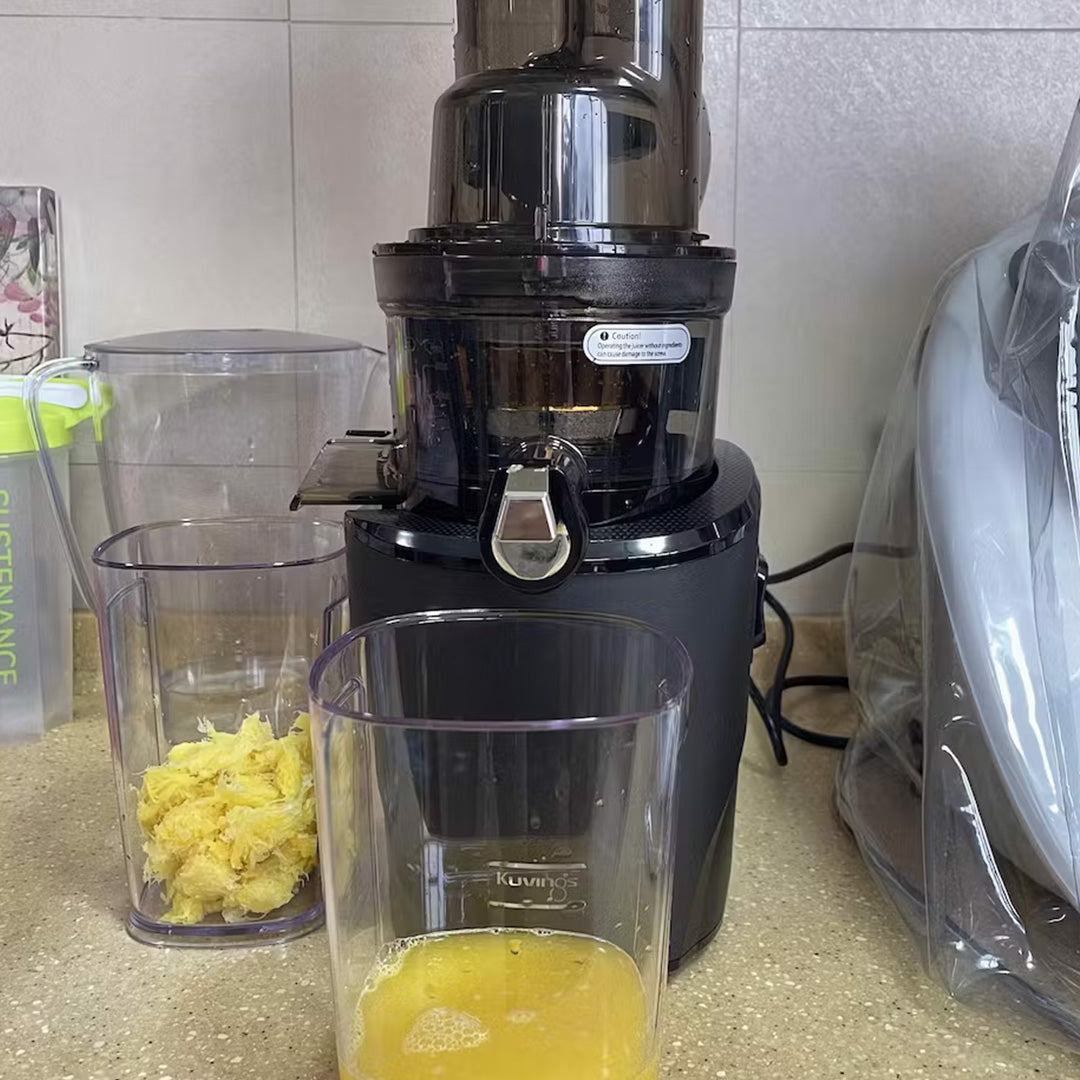 Kuvings REVO830 přináší na trh odšťavňovačů zásadní a vysoce komfortní inovaci! Jako jediný na světě nabízí dva plnící otvory s funkcí automatického krájení, což činí odšťavňování snadnějším než kdykoliv předtím. Díky těmto jedinečným vlastnostem získal Kuvings ocenění Kitchen Innovation Award 2022 ve čtyřech kategoriích: funkčnost, design, inovace a ergonomie.