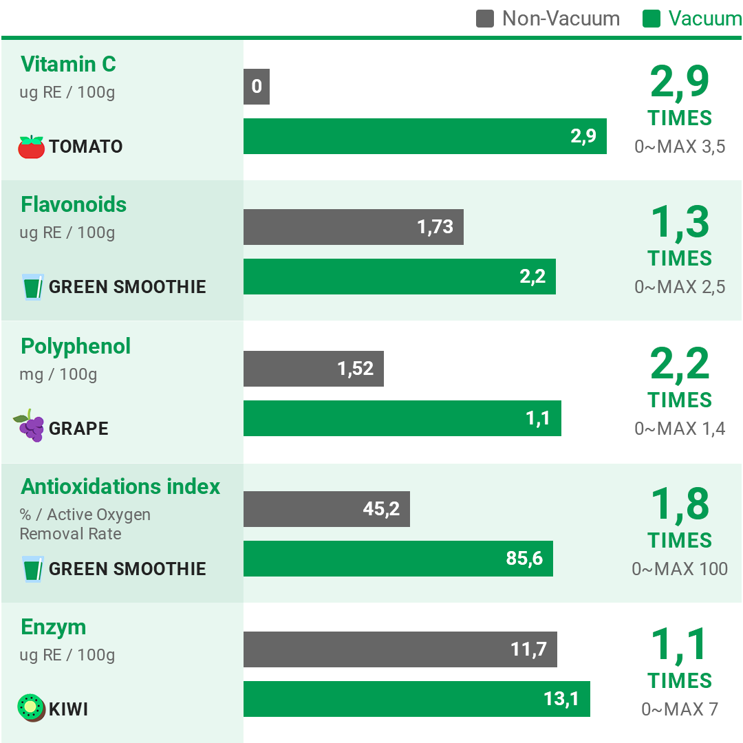 Vacuum technology prevents food oxidation and provides the highest level of vitamins and nutrients compared to our conventional centrifugal blender.