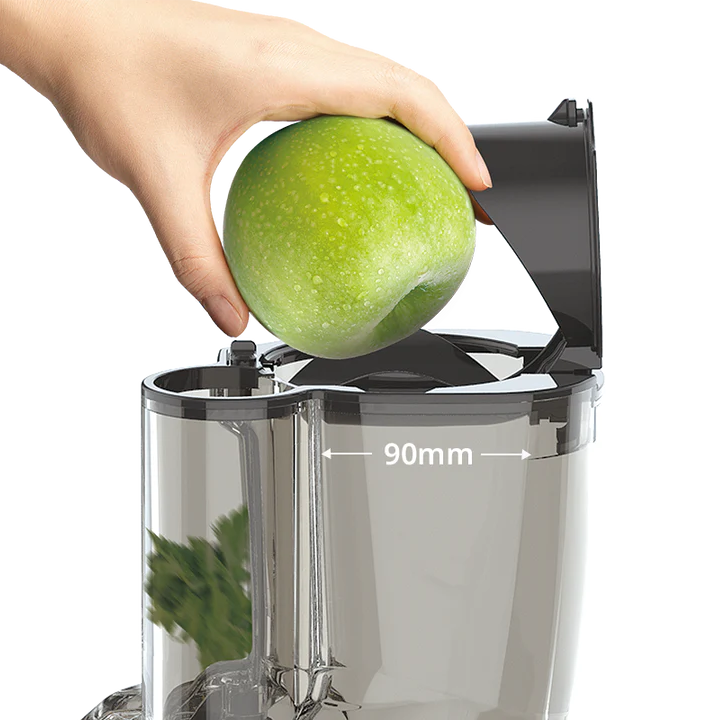 The 90mm feeding chute, which is wider than the existing models can allow to drop the larger ingredients without cutting, which leads to fast juicing.